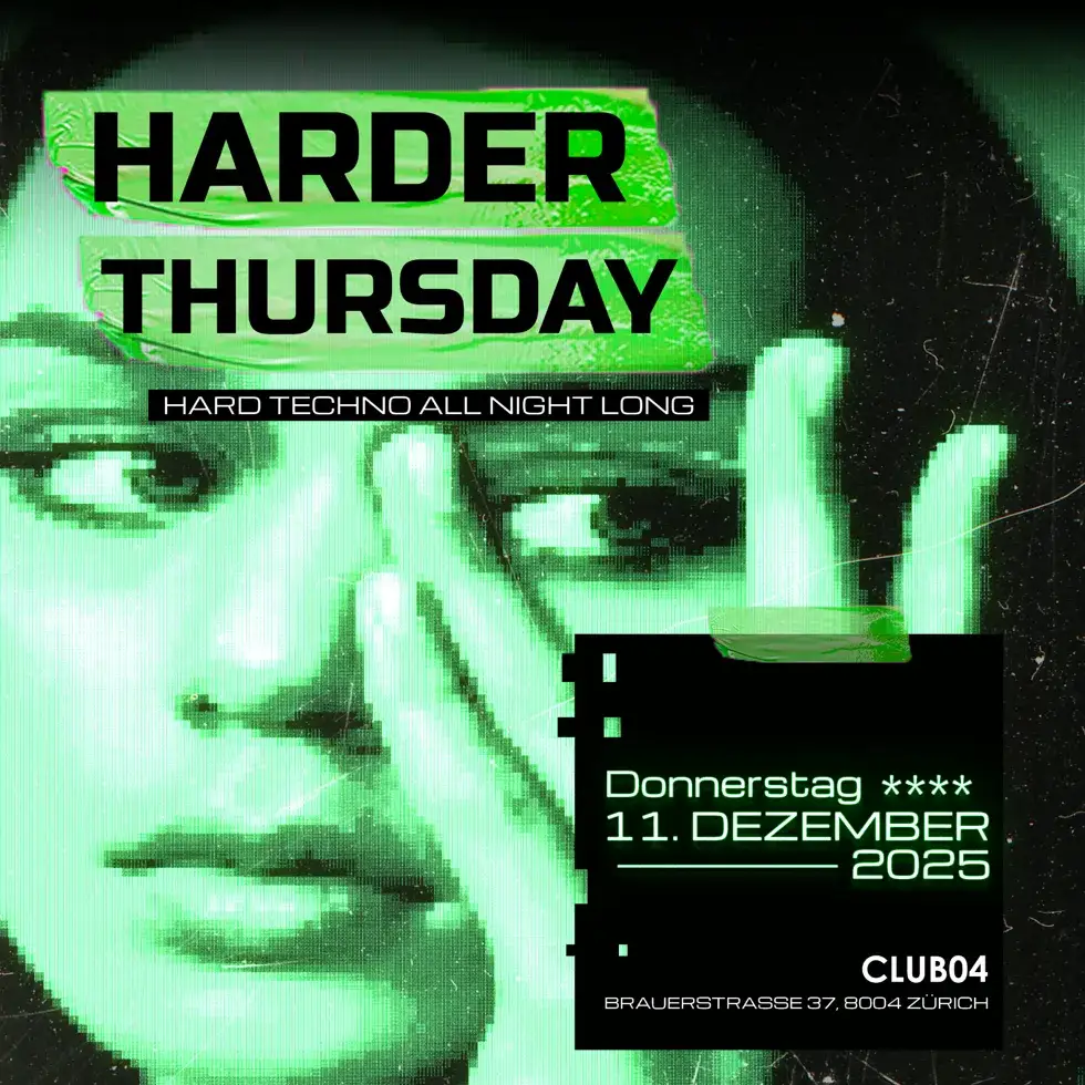 Techno stuff This Thursday is looking pretty cool – it's got a raw, powerful and uncompromising vibe. When CLUB04 transforms into an arena full of energy and sound, there's only one direction — harder, faster, louder. Right in the middle of the week, right in the heart of it: HARDER THURSDAY delivers some serious energy, with deep bass and relentless hardness that just keeps on going. No long foreplay – full intensity right from the start. This is hard techno at its most basic. No waiting for the weekend – Thursday is now all about maximum demolition.