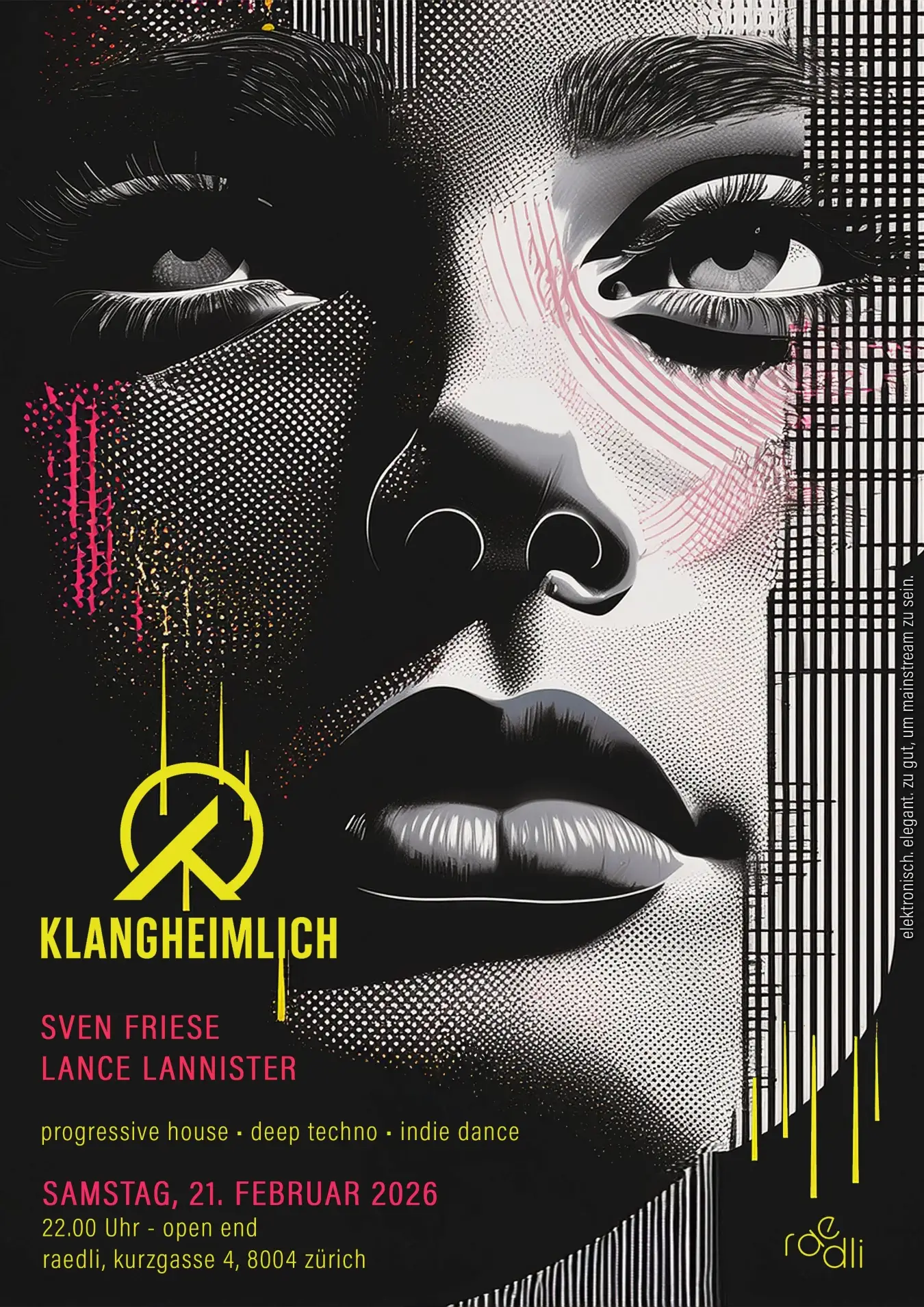 KLANGHEIMLICH – Electronic, Elegant, Unconventional Not your average club night. Minimal show, maximum substance — a true insider tip. Behind the decks: Sven Friese (Hive/Grundton) and Lance Lannister (Sonik), veteran selectors with unmatched flow. Expect a mix of Progressive House, Deep Techno, Indie Dance, and electronic poetry — always delivered with skill, attitude, and that special something.